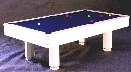 Abb.: Holzart Buche weiß lackiert Tuchfarbe: blau Pool 5 + 6 mit 6 Füßen. Die modern - classische Form des Billard. Eine Eingliederung als Wohn-, Eß- oder Schreibtisch ist mit einer entsprechenden Abdeckplatte aus dem Zubehörprogramm ist auch hier möglich. Die Tischhöhe ist verstellbar und beträgt 79 cm - 81 cm. Der Sockelkörper besteht aus mehreren einzelnen Teilen und ist mit wenigen Handgriffen aufgebaut. Spielfläche und Bandenrahmen liegen schwingungsfrei auf einem Trägerrahmen. Die Höhenverstellung erfolgt durch in den Fußgestellen eingelassene Schraubfüße um event. Unebenheiten des Bodens auszugleichen. Diese sind der Form der Füße angepasst. Die Ballfangtaschen bei den Poolmodellen sind in den Bandenrahmen eingesetzt. Für den Transport läßt sich der Tisch komplett zerlegen. Größtes Teil ist der einteilige Bandenrahmen. Dieser ist standardmäßig in einem Stück verleimt. Ein zerlegbarer Bandenrahmen ist auf Wunsch möglich. Sie können Wählen: Lackierung in ca. 170 RAL- Farben. Lackierungen alle seidenmatt. Sonderausführungen auf Wunsch möglich. Tuch-Bespannung: Grundausstattung Grün oder Blau, Rot, Grau, Schwarz. Technische Änderungen vorbehalten, Zubehör ist nicht im Preis enthalten. Preis inkl. gesetzlicher Mehrwertsteuer: ab 2.295.- € Carambolage 1 Außenmaß: ca. 138 x 243 cm Spielfeld: 105 x 210 cm. Mindestraumbedarf: 305 x 410 cm. Spielfeld aus spezialbeschichter Verbundplatte (30mm 1-teilig) Gewicht ca. 180 kg Bestell- Nr.: 098 03 01 Carambolage 2 Außenmaß: ca. 138 x 243 cm Spielfeld: 105 x 210 cm. Mindestraumbedarf: 305 x 410 cm. Spielfeld aus Naturschiefer (19mm 1-teilig) Gewicht ca. 240 kg Bestell- Nr.: 098 03 02 Pool 1 Außenmaß: ca. 132 x 231 cm Spielfeld: 99 x 198 cm. 7 Ft. Mindestraumbedarf: 299 x 398 cm. Spielfeld aus spezialbeschichter Verbundplatte (30mm 1-teilig) Gewicht ca. 170 kg Bestell- Nr.: 098 03 03 Pool 2 Außenmaß: ca. 132 x 231 cm Spielfeld: 99 x 198 cm. 7 Ft. Mindestraumbedarf: 299 x 398 cm. Spielfeld aus Naturschiefer (19mm 1-teilig) Gewicht ca. 230 kg Bestell- Nr.: 098 03 04 Pool 3 Außenmaß: ca. 145 x 257 cm Spielfeld: 112 x 224 cm. 8 Ft. Mindestraumbedarf: 312 x 424 cm. Spielfeld aus spezialbeschichter Verbundplatte (30mm 1-teilig) Gewicht ca. 200 kg Bestell- Nr.: 098 03 05 Pool 4 Außenmaß: ca. 145 x 257 cm Spielfeld: 112 x 224 cm. 8 Ft. Mindestraumbedarf: 312 x 424 cm. Spielfeld aus Naturschiefer (22mm 3-teilig) Gewicht ca. 290 kg Bestell- Nr.: 098 03 06 Pool 5 Außenmaß: ca. 160 x 287 cm Spielfeld: 127 x 254 cm. 9 Ft. Mindestraumbedarf: 327 x 454 cm. Spielfeld aus spezialbeschichter Verbundplatte (30mm 1-teilig) Gewicht ca. 225 kg Bestell- Nr.: 098 03 07 Pool 6 Außenmaß: ca. 160 x 287 cm Spielfeld: 127 x 254 cm. 9 Ft. Mindestraumbedarf: 327 x 454 cm. Spielfeld aus Naturschiefer (25mm 3-teilig) Gewicht ca. 370 kg Bestell- Nr.: 098 03 08 Abdeckplatte, 2-teilig zur Verwendung des Billardtisches als Wohn-, Eß- oder Schreibtisch. Passend zum Tisch. Bitte geben Sie bei Nachbestellung die Nummer und Farbe des Tisches an. Bestell- Nr.: 098 03 10 Anspielpunkte in den Rahmen eingelassen, nicht aufgedruckt. Bestell- Nr.: 098 03 11 Spielfertige Aufstellung auf Anfrage. Weitere Größen für Carambolage auf Wunsch möglich! |